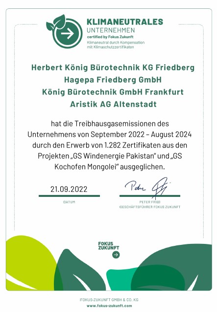 Nun haben wir sowie 3 weitere Unternehmen der KÖNIG-GRUPPE die restlich noch verbleibenden CO2-Werte kompensiert und über den Ankauf von CO2-Goldzertifikaten bis August 2024 ausgeglichen.
